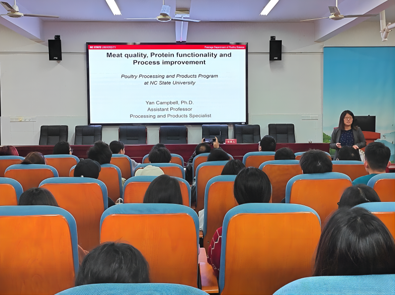 李艳介绍了美国在鸡肉产品加工过程中的一重大挑战即鸡胸肉木质化。针对此现象,她讲述了腌制火腿肉的工艺改良和自动化屠宰生产线的应用,以及未来在肉蛋制品加工领域的潜在研究方向。