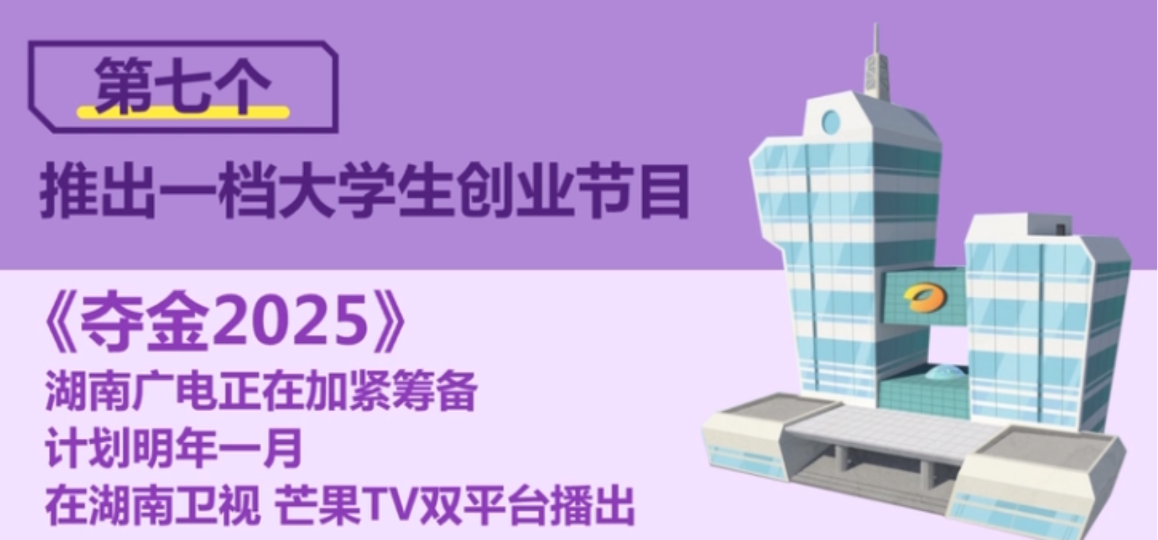 推出一档大学生创业节目《夺金 2025》,在湖南卫视、芒果 TV 黄金时段播出,营造浓厚创业氛围。