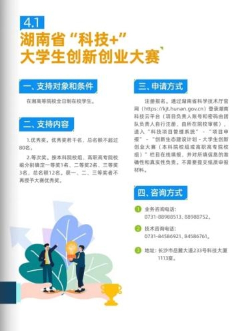 项目设立聚焦大学生创新创业,有“科技 +”创新创业大赛、大学生创业项目库,还涉及高校科研院所横向项目备案。人才相关政策,一方面聚焦科技创新,选拔湖湘青年英才;另一方面针对大学生创业,开展创业导师申报工作。
