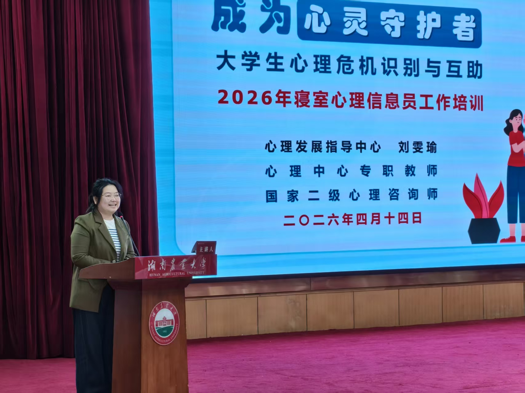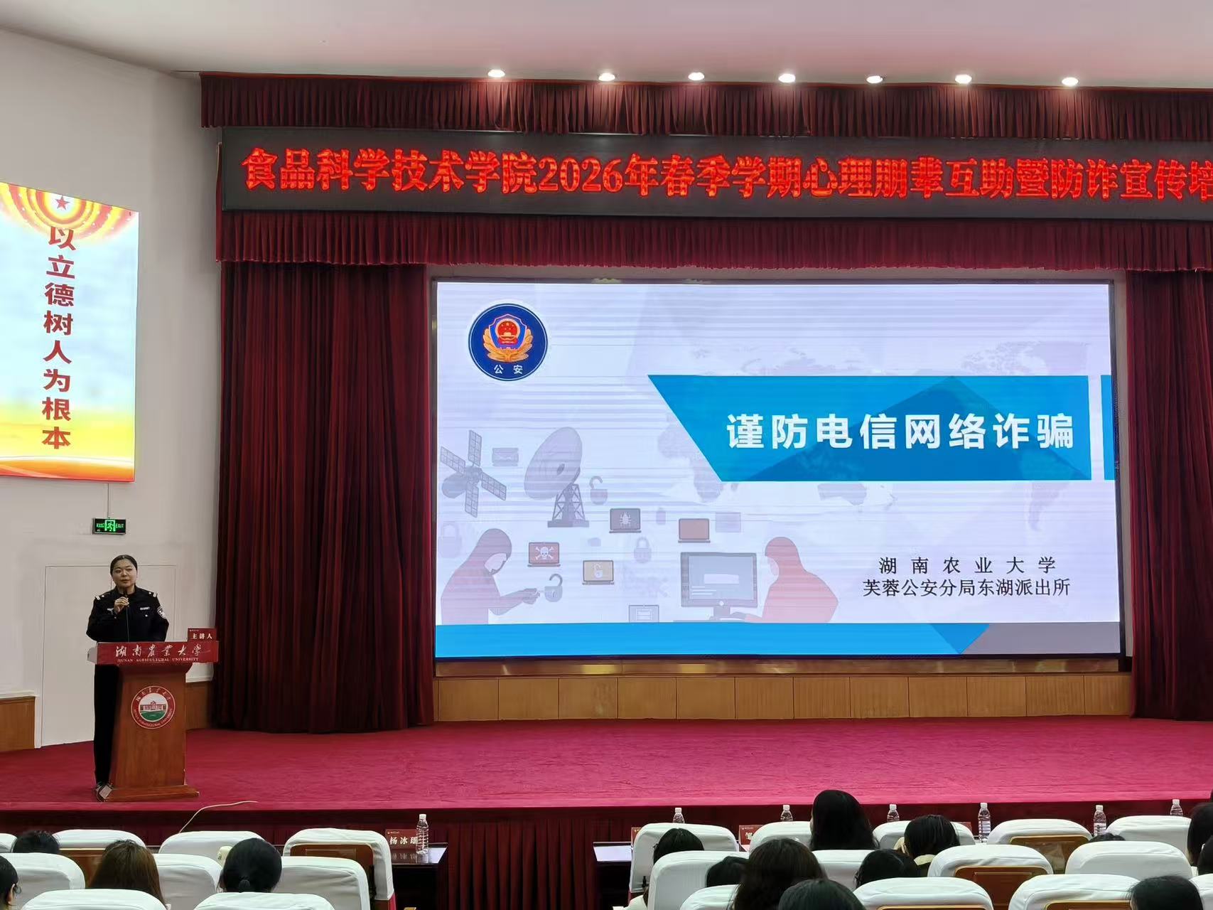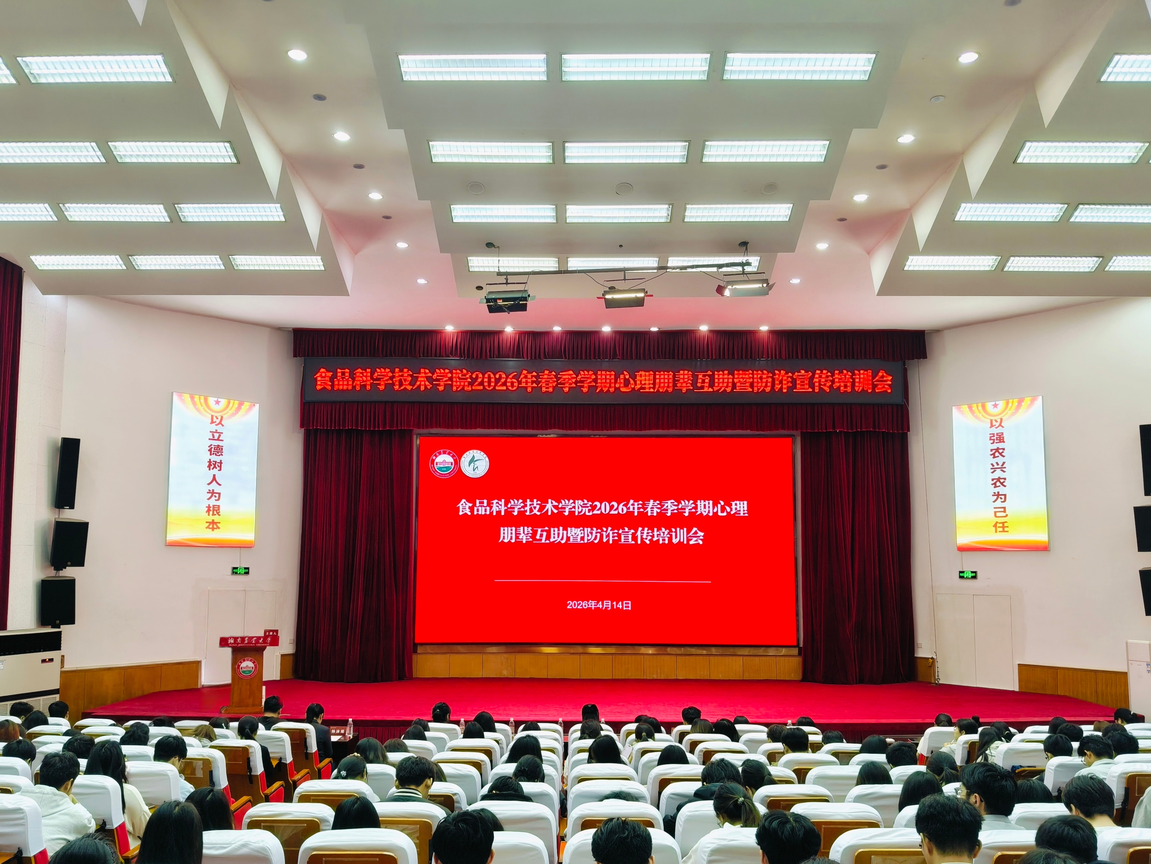 (食品科学技术学院 杨冰瑶 何凌萍 刘歆瞳 唐诗敏)为进一步筑牢校园安全防线,加强校园心理健康防护体系建设,筑牢班级心理安全防线,提升反诈防骗意识,学院于4月14日中午在修业讲堂举办2026年春季学期心理朋辈互助暨防诈宣传培训会。学院党委副书记童玲、全体辅导员、各班级心理委员、班长、团支书、寝室长及研究生代表等近300人参加此次培训,会议由学院心理专干杨冰瑶老师主持。