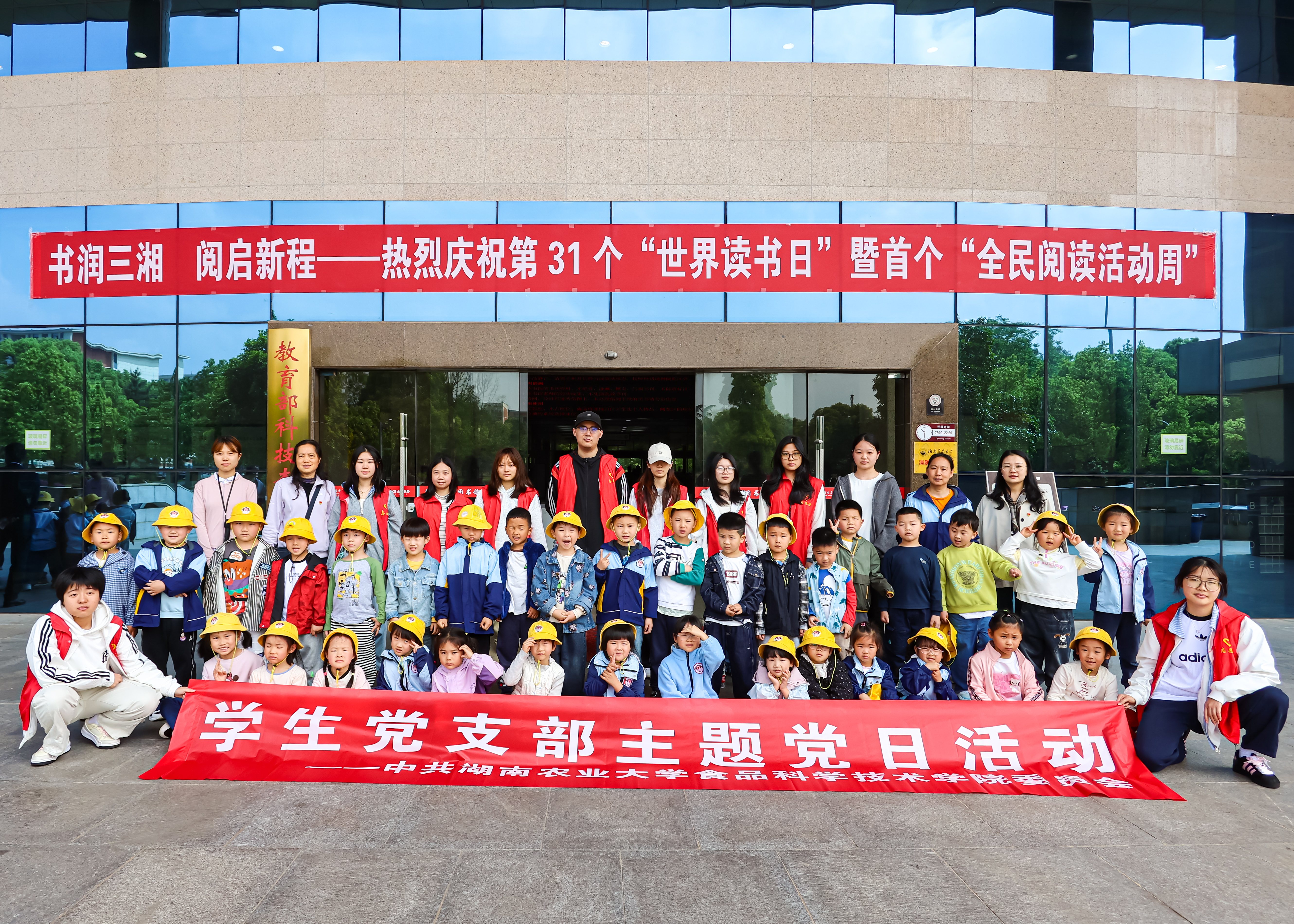 (食品科学技术学院黄也 冯壹梅 易钰婷 史佩宜 李湘媛)为进一步丰富主题党日活动内容,4 月 24 日,食品科学技术学院携手芙蓉区纽尊幼儿园,在湖南农业大学图书馆温情开展 “书香润童心,研学启新程” 主题党日活动,以书香浸润童心、以实践涵养品格。学院学生党支部党员、青年志愿者全程陪伴,带领小朋友走进书香殿堂,在沉浸式研学中感受知识温度、厚植爱读书、爱学习的美好品质。